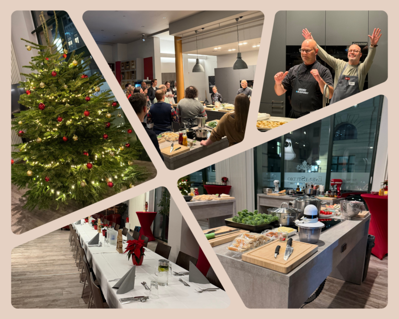 Und was sagt der Geschmackstest? Klirrendes Besteck, lächelnde Gesichter und leere Teller sprachen wohl für sich. Genügend Zeit zum Austausch mit den KollegInnen blieb dabei auch noch. Zwischen den Bürotüren wird inzwischen auch schon gemunkelt, dass es demnächst auch im neuen Büro hin und wieder eine kleine Kochaktion geben könnte. Abgerundet wurde der Abend noch von einer kleinen Weihnachtsüberraschung, die unsere Vorstände den MitarbeiterInnen bei der Verabschiedung überreichten.