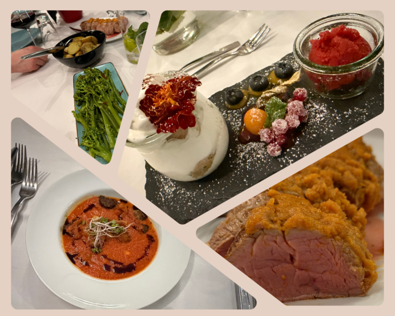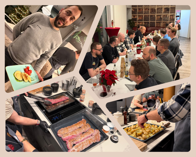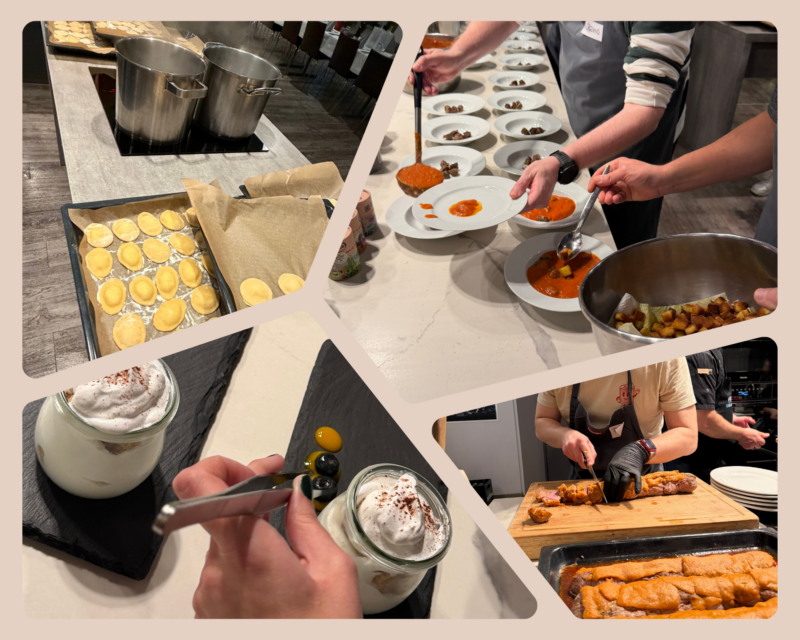 Natürlich darf im Weihnachtsfeier Rückblick das Kochen selbst nicht fehlen: Gemeinsam wurden Zutaten geschnippelt, Teig geknetet, gezupft, gefüllt und gelacht. Der Duft der langsam köchelnden Tomatensuppe erfüllte das Studio, während an anderer Stelle konzentriert Ravioli geformt wurden. Dabei entpuppte sich besonders unser Product Owner Mathias als “Experte der italienischen Küche”. Später brutzelte das Kalbsfilet mit seiner Chorizo-Kruste im Ofen, begleitet vom aromatischen Duft frischer Rosmarinkartoffeln. Vor allem die Fleisch-Liebhaber in unserem Team motivierte das zu angeregten Diskussionen über die perfekte Zubereitung von gegrillten oder gebratenen Speisen. Den Abschluss bildeten ein cremiges veganes Tiramisu und ein spritziges Himbeer-Limetten-Ingwer-Sorbet.
